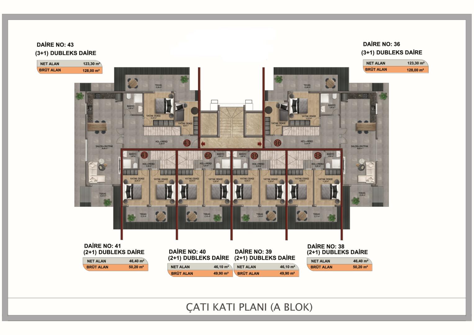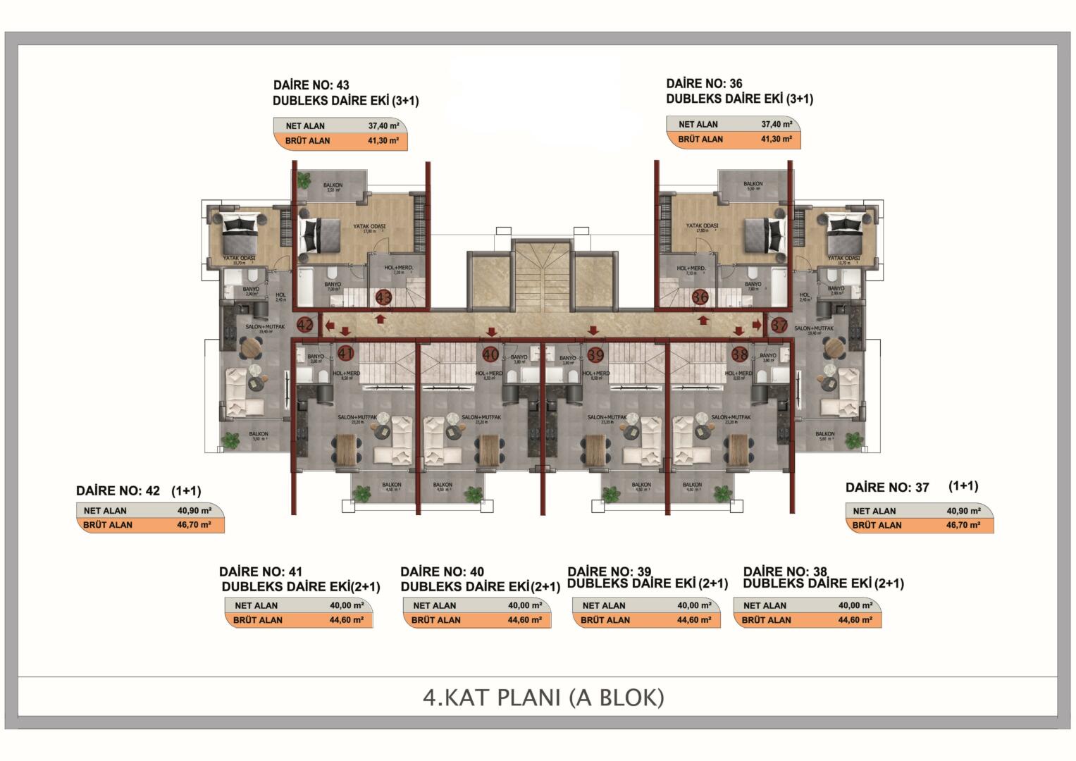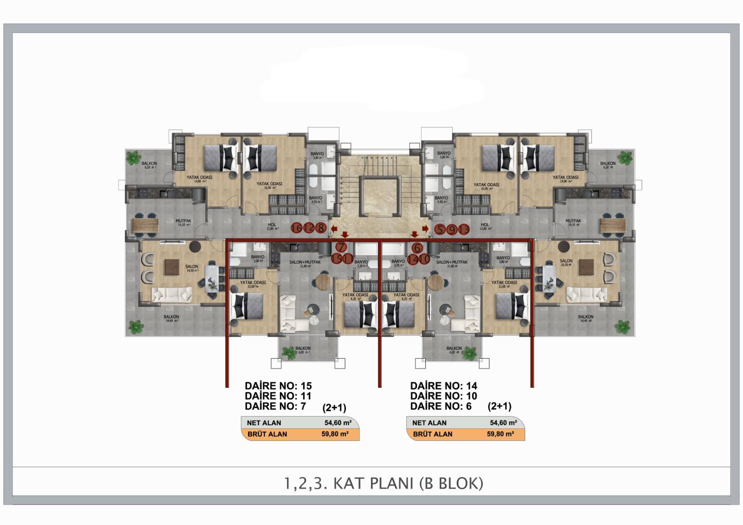 شقة 2+1؛ 59.80 م2- 73.00 م2 – 94.80 م2 -113 م² شقة 3+1؛ 129,80 م2 – 169,30 م2 المناطق الاجتماعية المفتوحة: