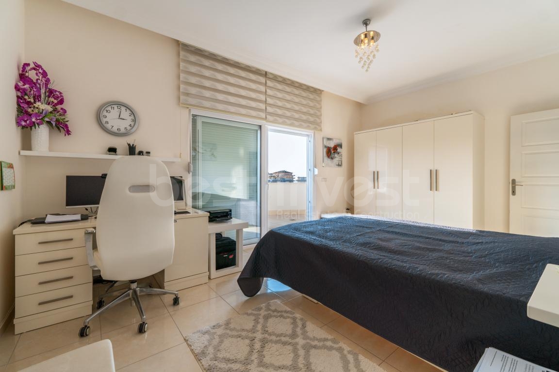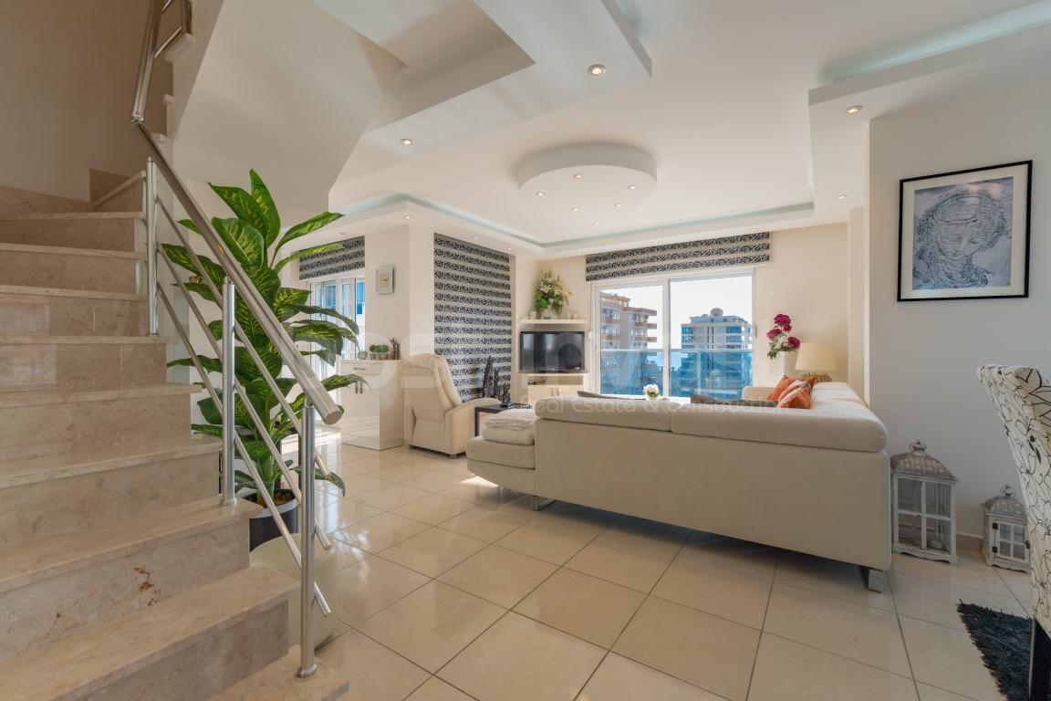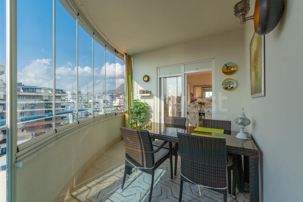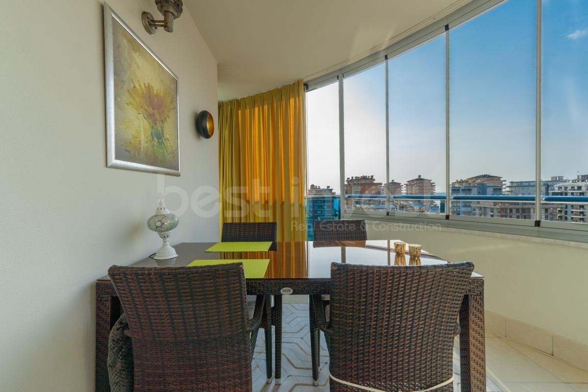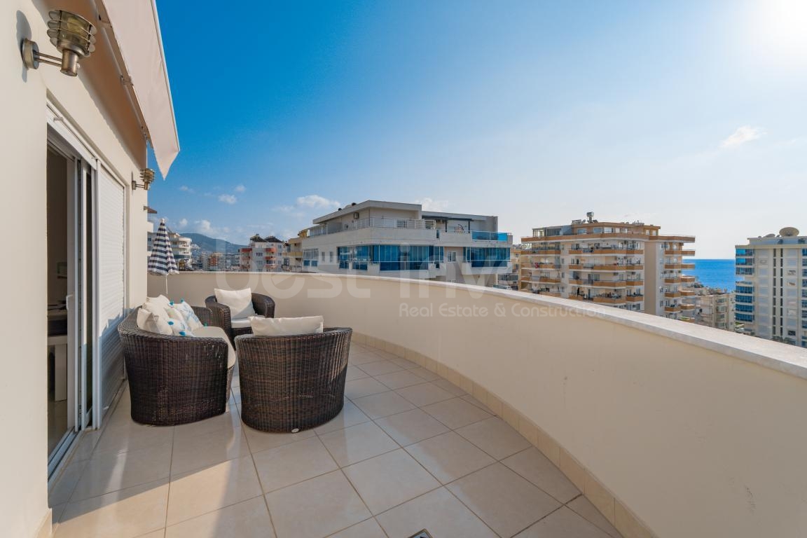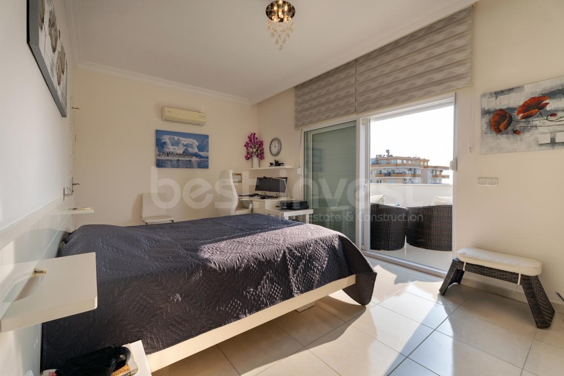 Fast alle Möbel sind Sonderanfertigungen einer renommierten Möbelfabrik in Ankara – von Betten, Kleiderschränken und Badezimmermöbeln bis hin zum maßgefertigten Weinregal und TV-Schrank. Die Außenbereiche sind etwas ganz Besonderes. Der große Balkon auf der unteren Ebene verläuft in einem eleganten Halbkreis von Ost nach West, was sowohl für herrliche Morgensonne als auch für wunderschöne Sonnenuntergänge sorgt. Ein Teil des Balkons ist zudem verglast und kann das ganze Jahr über genutzt werden. Auf der oberen Ebene erwartet Sie die großzügige, abgerundete Dachterrasse in optimaler Südlage mit Meerblick und einer beeindruckenden 180-Grad-Aussicht. Eine elektrische Markise sorgt für angenehmen Schatten. Als zusätzlicher Bonus gibt es einen weiteren Balkon auf der unteren Etage, der nach Westen ausgerichtet ist und sowohl vom Schlafzimmer als auch vom Wohnzimmer aus zugänglich ist.