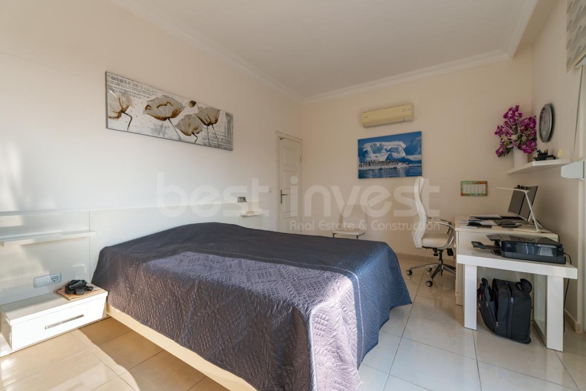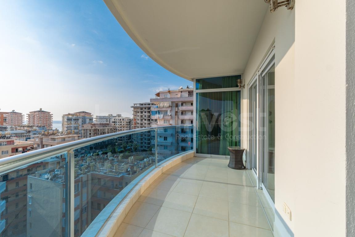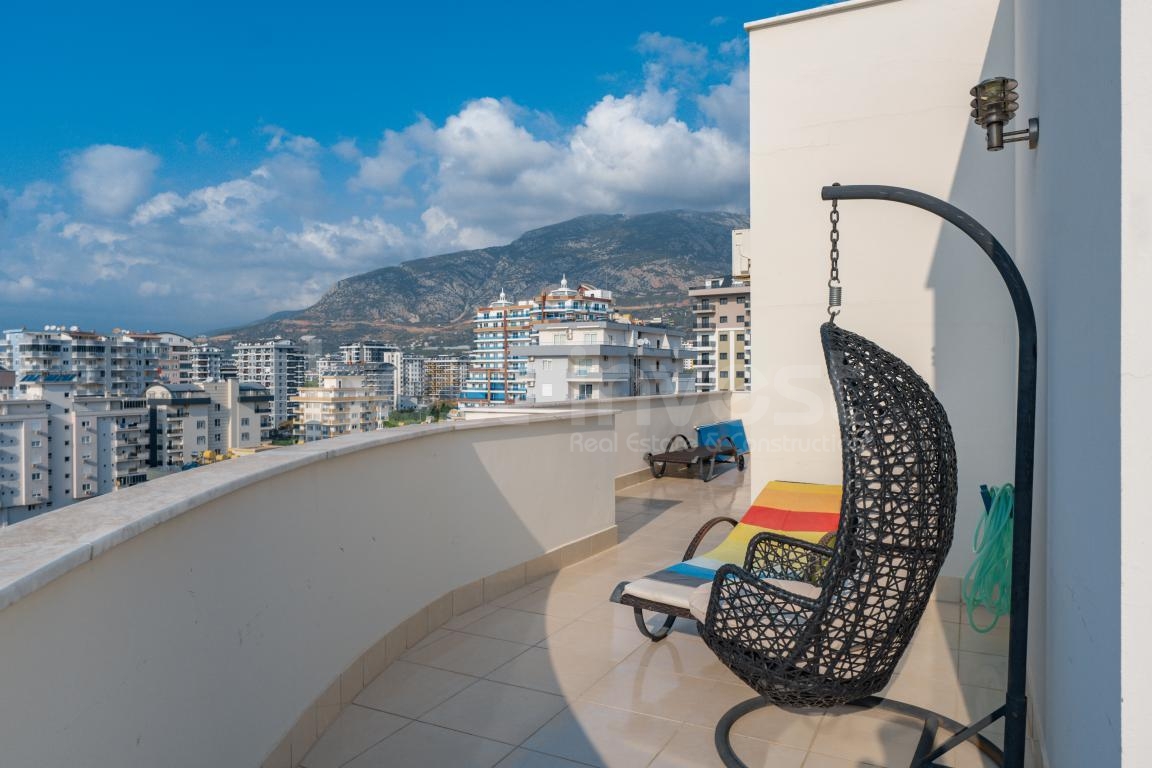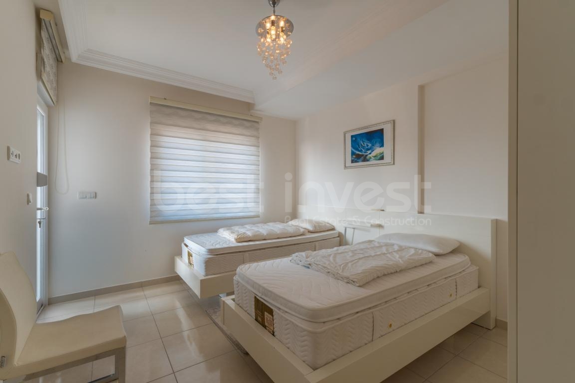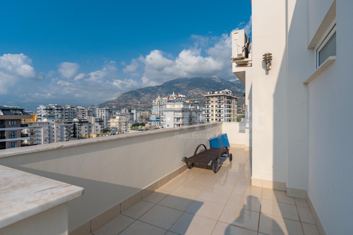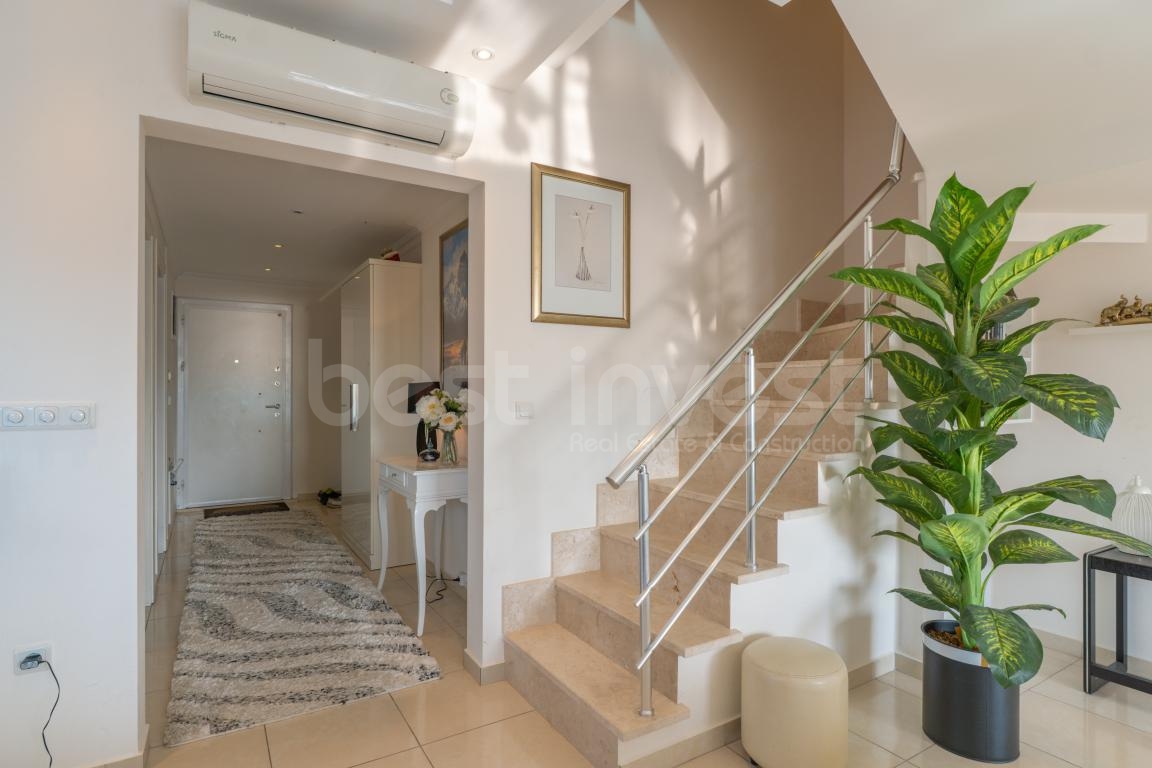 Fast alle Möbel sind Sonderanfertigungen einer renommierten Möbelfabrik in Ankara – von Betten, Kleiderschränken und Badezimmermöbeln bis hin zum maßgefertigten Weinregal und TV-Schrank. Die Außenbereiche sind etwas ganz Besonderes. Der große Balkon auf der unteren Ebene verläuft in einem eleganten Halbkreis von Ost nach West, was sowohl für herrliche Morgensonne als auch für wunderschöne Sonnenuntergänge sorgt. Ein Teil des Balkons ist zudem verglast und kann das ganze Jahr über genutzt werden. Auf der oberen Ebene erwartet Sie die großzügige, abgerundete Dachterrasse in optimaler Südlage mit Meerblick und einer beeindruckenden 180-Grad-Aussicht. Eine elektrische Markise sorgt für angenehmen Schatten. Als zusätzlicher Bonus gibt es einen weiteren Balkon auf der unteren Etage, der nach Westen ausgerichtet ist und sowohl vom Schlafzimmer als auch vom Wohnzimmer aus zugänglich ist.