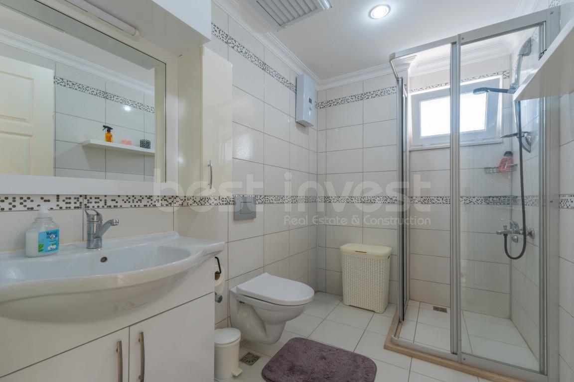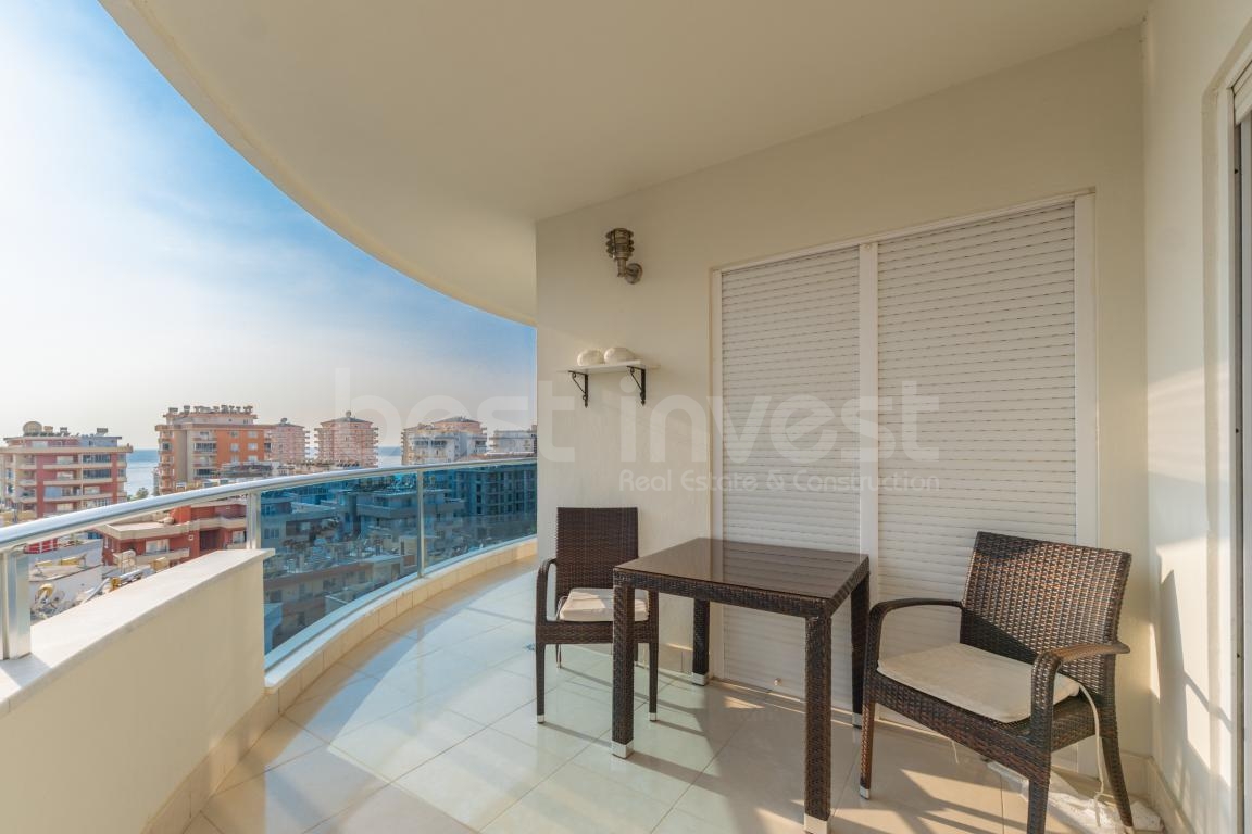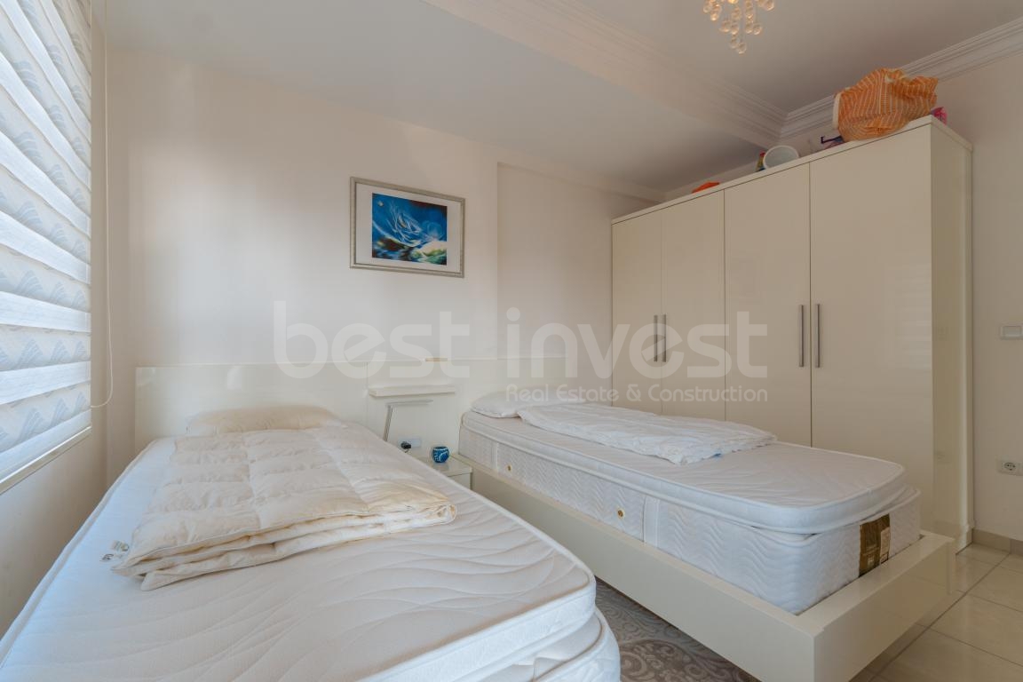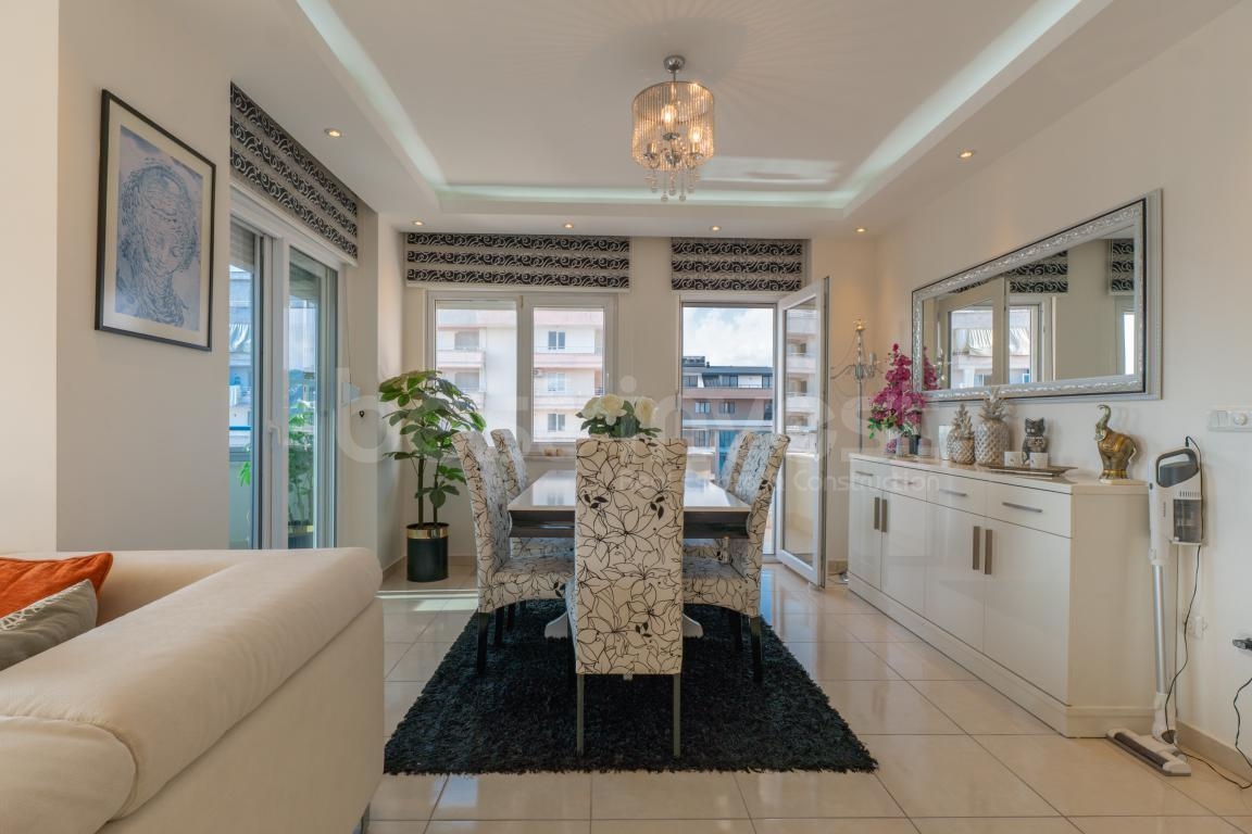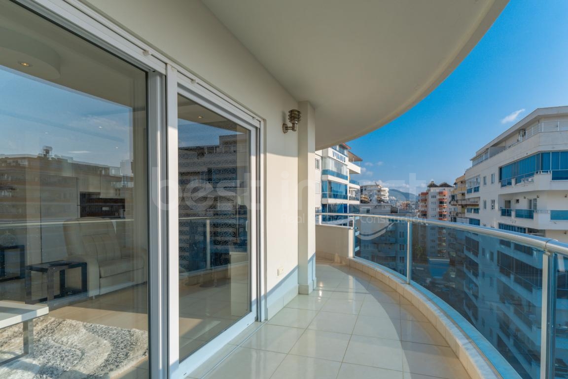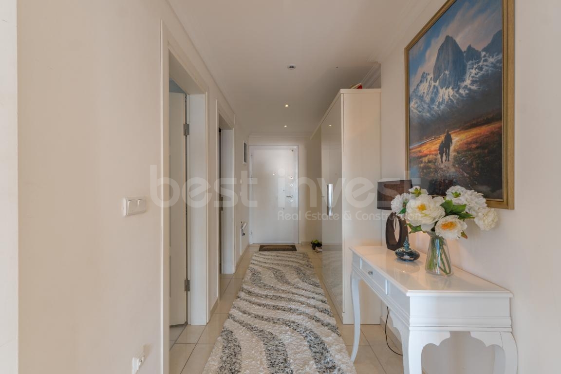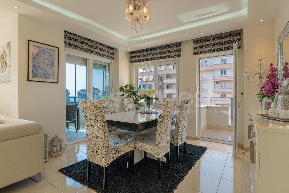 Fast alle Möbel sind Sonderanfertigungen einer renommierten Möbelfabrik in Ankara – von Betten, Kleiderschränken und Badezimmermöbeln bis hin zum maßgefertigten Weinregal und TV-Schrank. Die Außenbereiche sind etwas ganz Besonderes. Der große Balkon auf der unteren Ebene verläuft in einem eleganten Halbkreis von Ost nach West, was sowohl für herrliche Morgensonne als auch für wunderschöne Sonnenuntergänge sorgt. Ein Teil des Balkons ist zudem verglast und kann das ganze Jahr über genutzt werden. Auf der oberen Ebene erwartet Sie die großzügige, abgerundete Dachterrasse in optimaler Südlage mit Meerblick und einer beeindruckenden 180-Grad-Aussicht. Eine elektrische Markise sorgt für angenehmen Schatten. Als zusätzlicher Bonus gibt es einen weiteren Balkon auf der unteren Etage, der nach Westen ausgerichtet ist und sowohl vom Schlafzimmer als auch vom Wohnzimmer aus zugänglich ist.
