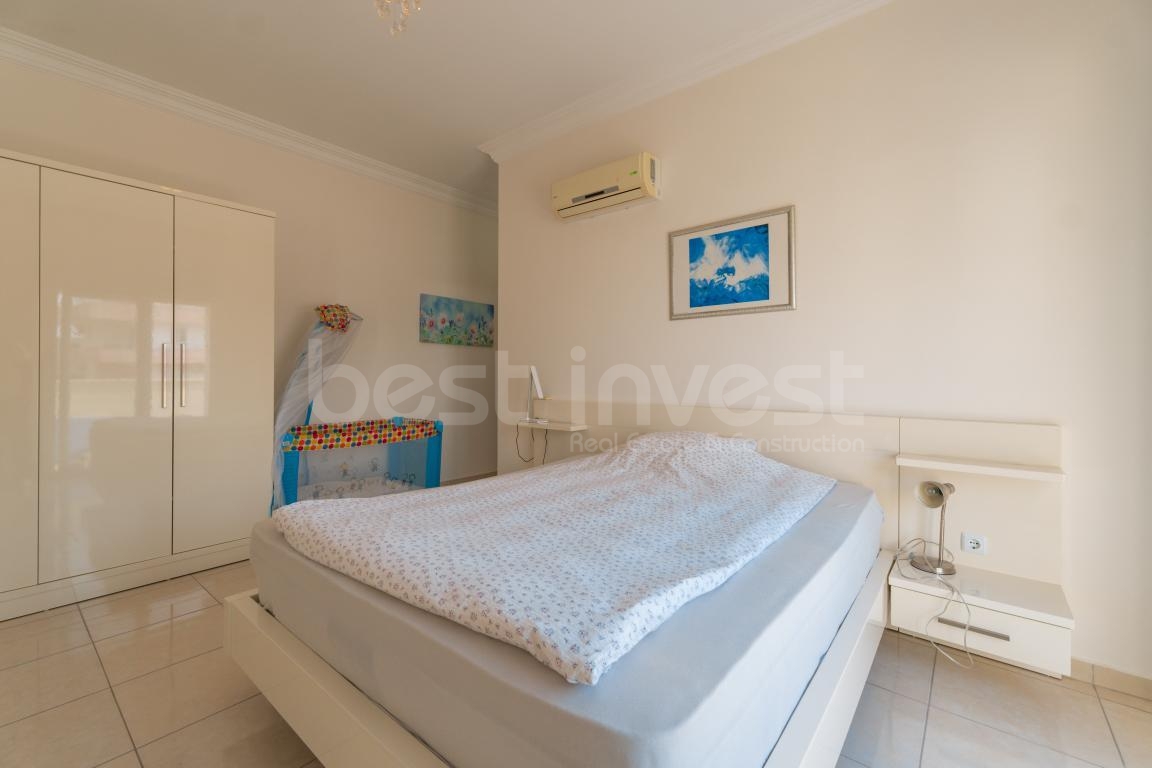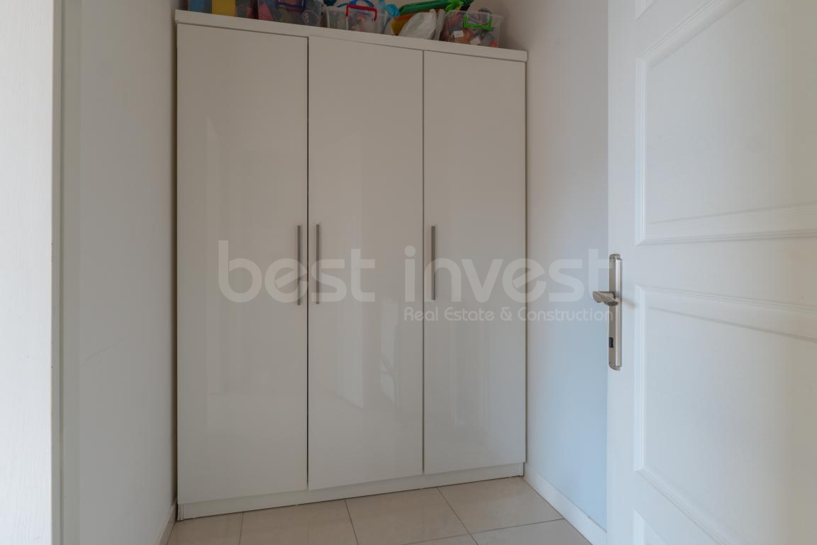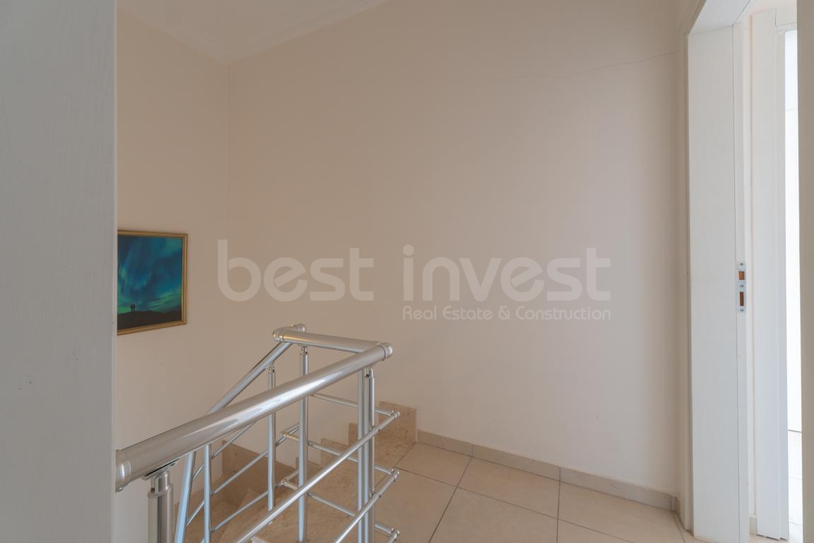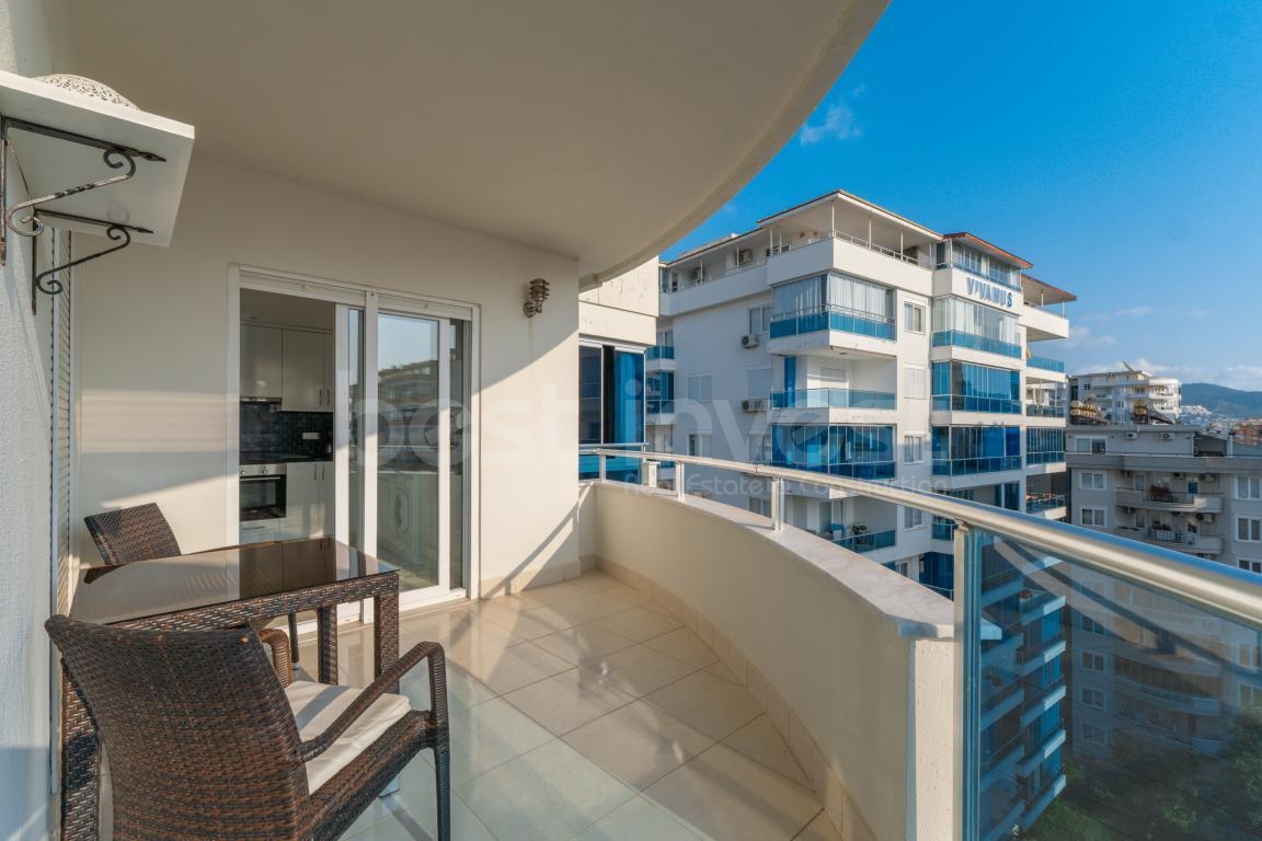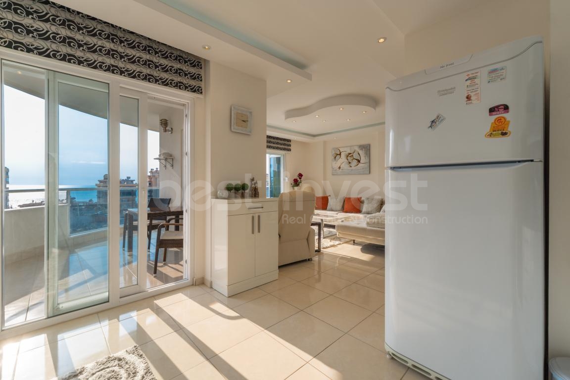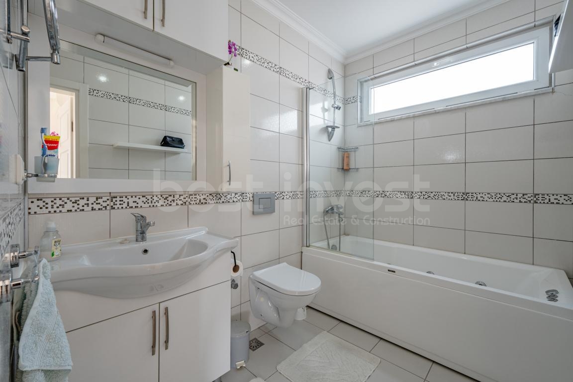Fast alle Möbel sind Sonderanfertigungen einer renommierten Möbelfabrik in Ankara – von Betten, Kleiderschränken und Badezimmermöbeln bis hin zum maßgefertigten Weinregal und TV-Schrank. Die Außenbereiche sind etwas ganz Besonderes. Der große Balkon auf der unteren Ebene verläuft in einem eleganten Halbkreis von Ost nach West, was sowohl für herrliche Morgensonne als auch für wunderschöne Sonnenuntergänge sorgt. Ein Teil des Balkons ist zudem verglast und kann das ganze Jahr über genutzt werden. Auf der oberen Ebene erwartet Sie die großzügige, abgerundete Dachterrasse in optimaler Südlage mit Meerblick und einer beeindruckenden 180-Grad-Aussicht. Eine elektrische Markise sorgt für angenehmen Schatten. Als zusätzlicher Bonus gibt es einen weiteren Balkon auf der unteren Etage, der nach Westen ausgerichtet ist und sowohl vom Schlafzimmer als auch vom Wohnzimmer aus zugänglich ist.
