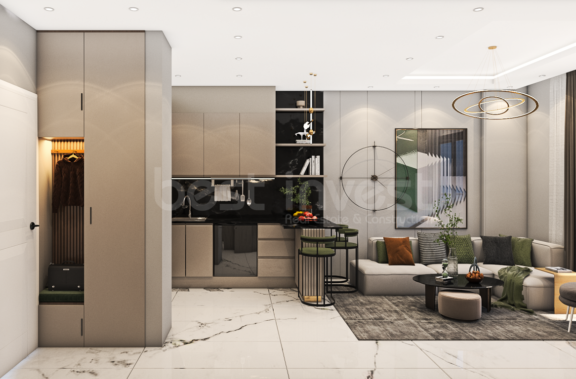 1+1 (55 м2) – апартаменты спальня + кухня в американском стиле (кухня совмещена с гостиной), 1 ванная и 1 балкон.