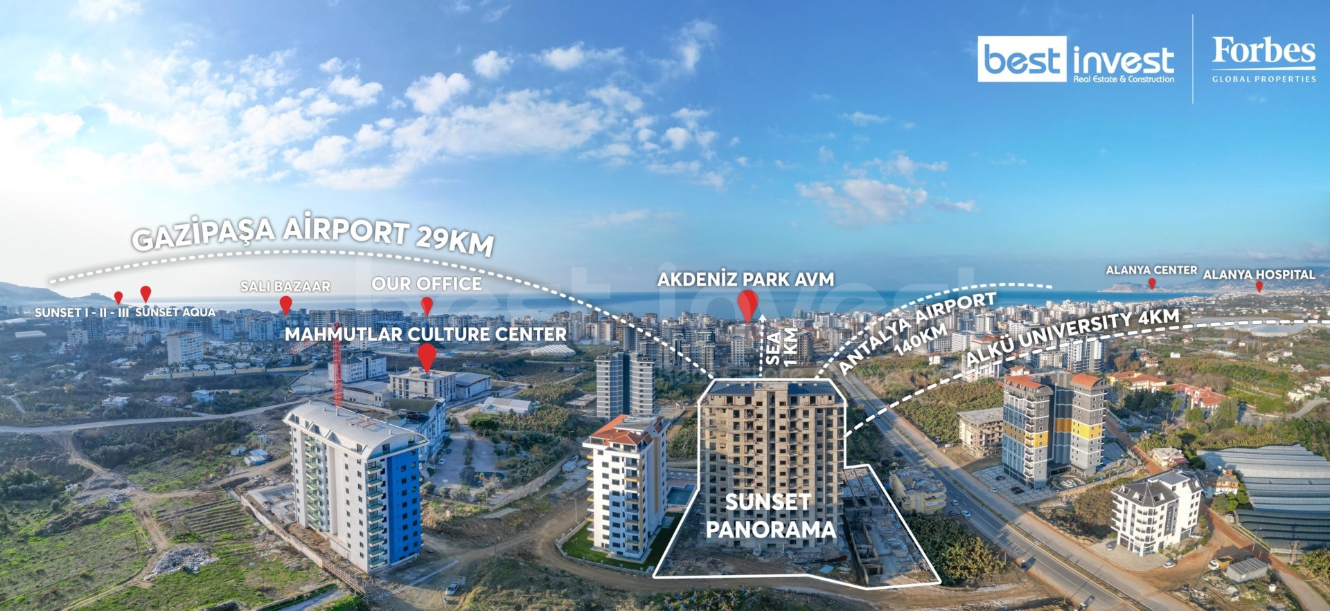 We as BEST INVEST have started the construction of an exclusive residential complex in Mahmutlar, Alanya with Topçu Group Company. Our SUNSET PANORAMA project is in 15-minute walking distance to the sea. Within walking distance there are cafes, restaurants, local bazaars, pharmacies and shops and Gazipasa airport is 25 km away from the complex.