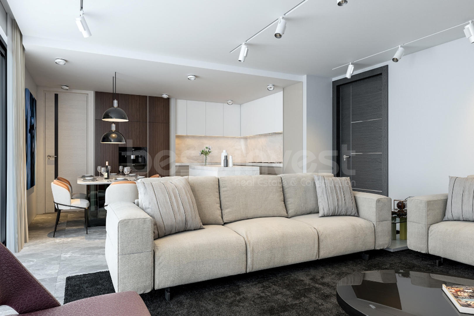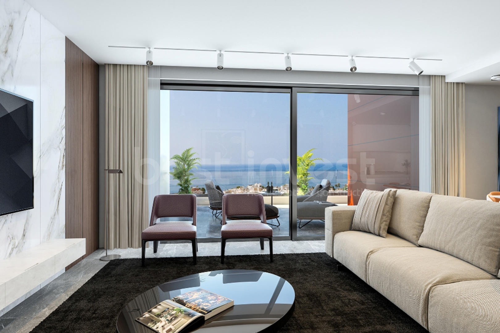 Son derece modern mimariye sahip olan bu daire, açık plan tam donanımlı mutfak ve oturma-yemek odasından oluşuyor ve Akdeniz manzarasını takdir ederken harika bir kapalı balkona açılıyor, açık havada yemek yeme ve eğlenme için mükemmel bir mekan sunuyor.