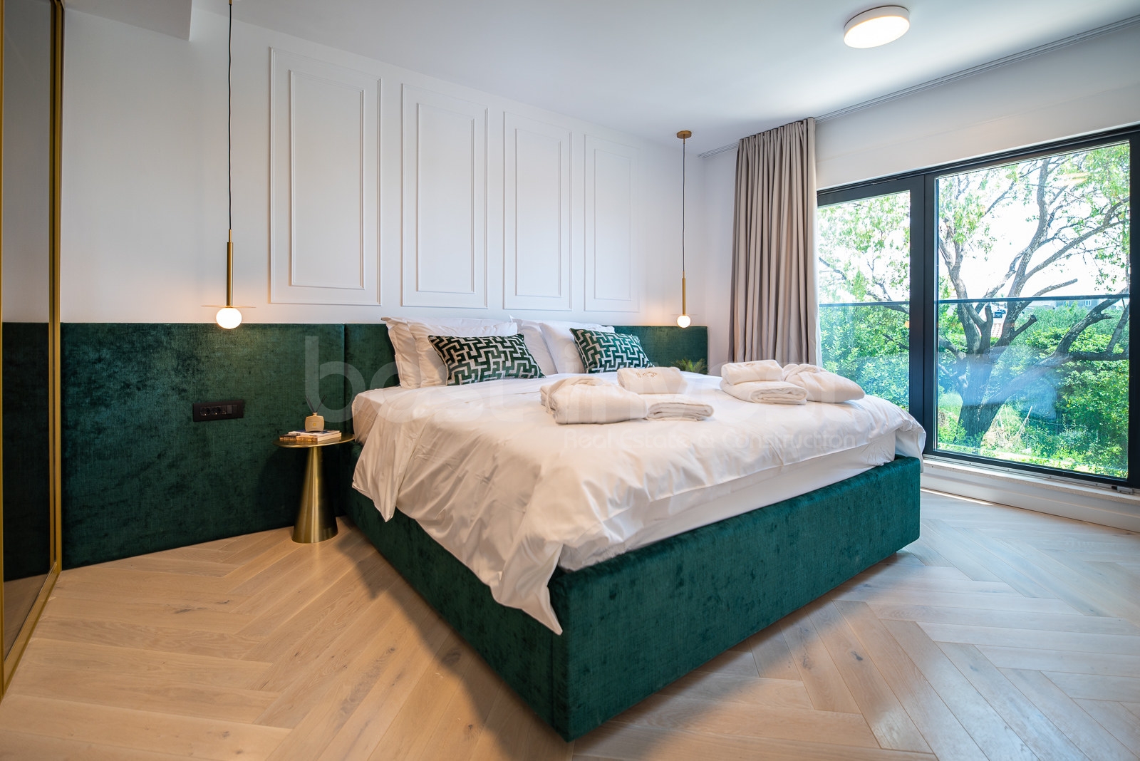 Villanın dış cephesi, açık havuz ve duş, yaz mutfağı, yeşil teras ve barbekü alanı ile tamamlanan bahçe ile zarafet ve eğlencenin uyumlu bir karışımını sergilemektedir. Daha fazla rahatlık için, şarap mahzeni veya fitness meraklıları için bir alan olarak da kullanılabilen geniş bir garaj içinde özel park yerleri bulunmaktadır.