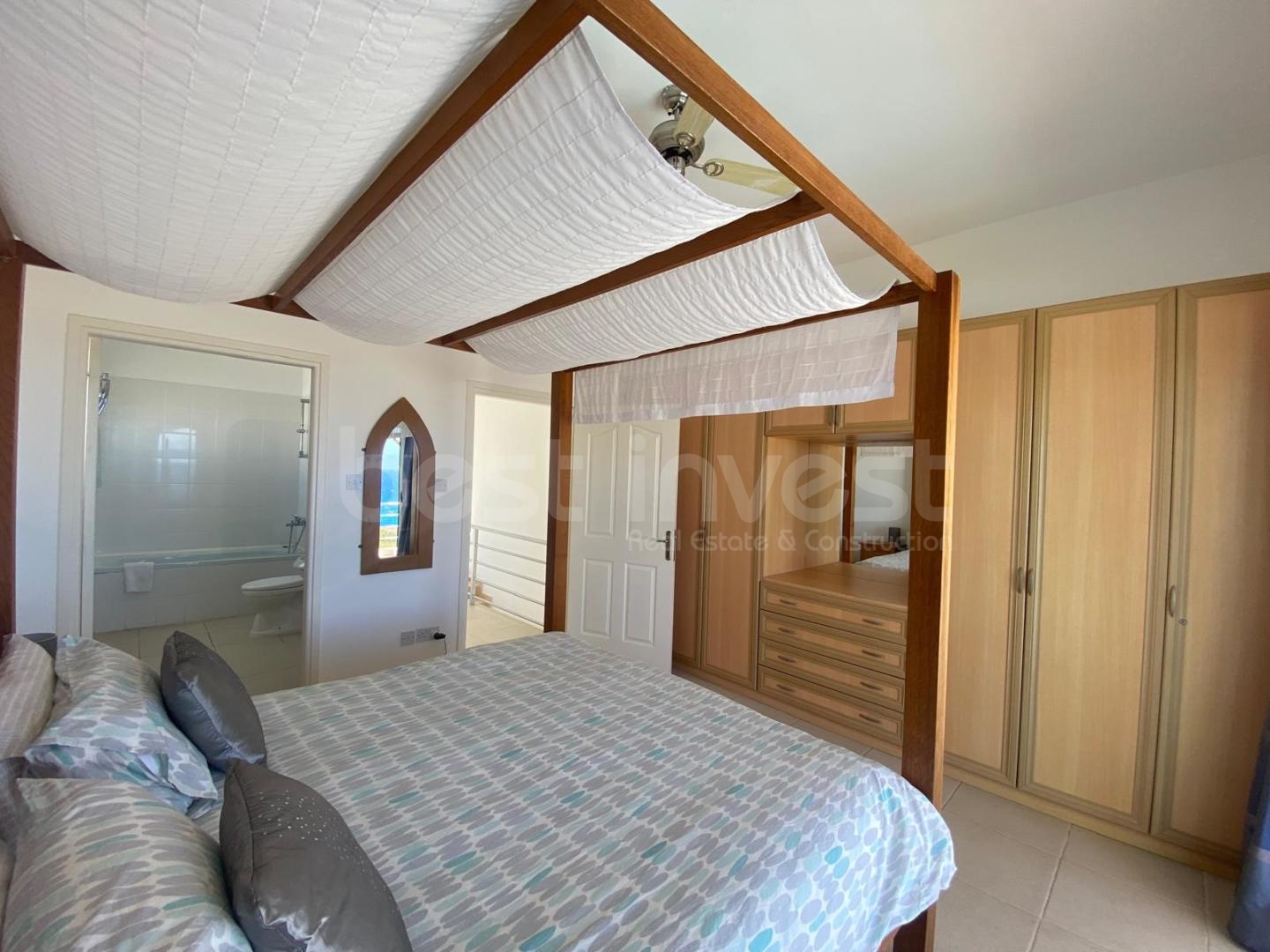 В доме три спальни с двуспальными кроватями, включая роскошную главную спальню на втором этаже с собственной ванной комнатой, встроенными шкафами, кондиционером и большой частной террасой с беседкой, шезлонгами и панорамным видом на море и горы. Остальные две спальни удобно расположены на первом этаже, что идеально подходит для гостей или членов семьи, предпочитающих не подниматься по лестнице.
